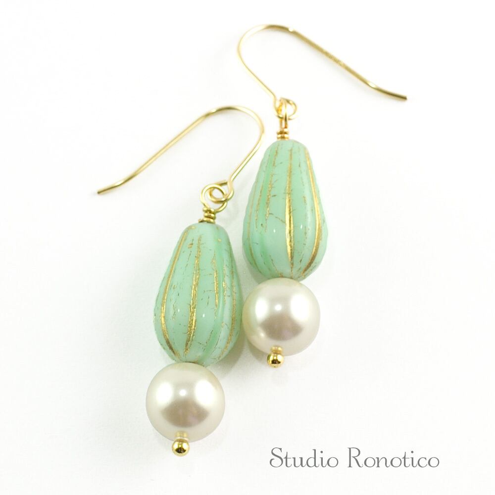 美しいターコイズグリーンのチェコビーズとオーストリア製クリスタルパールを使用した、上品なデザインのピアスです。