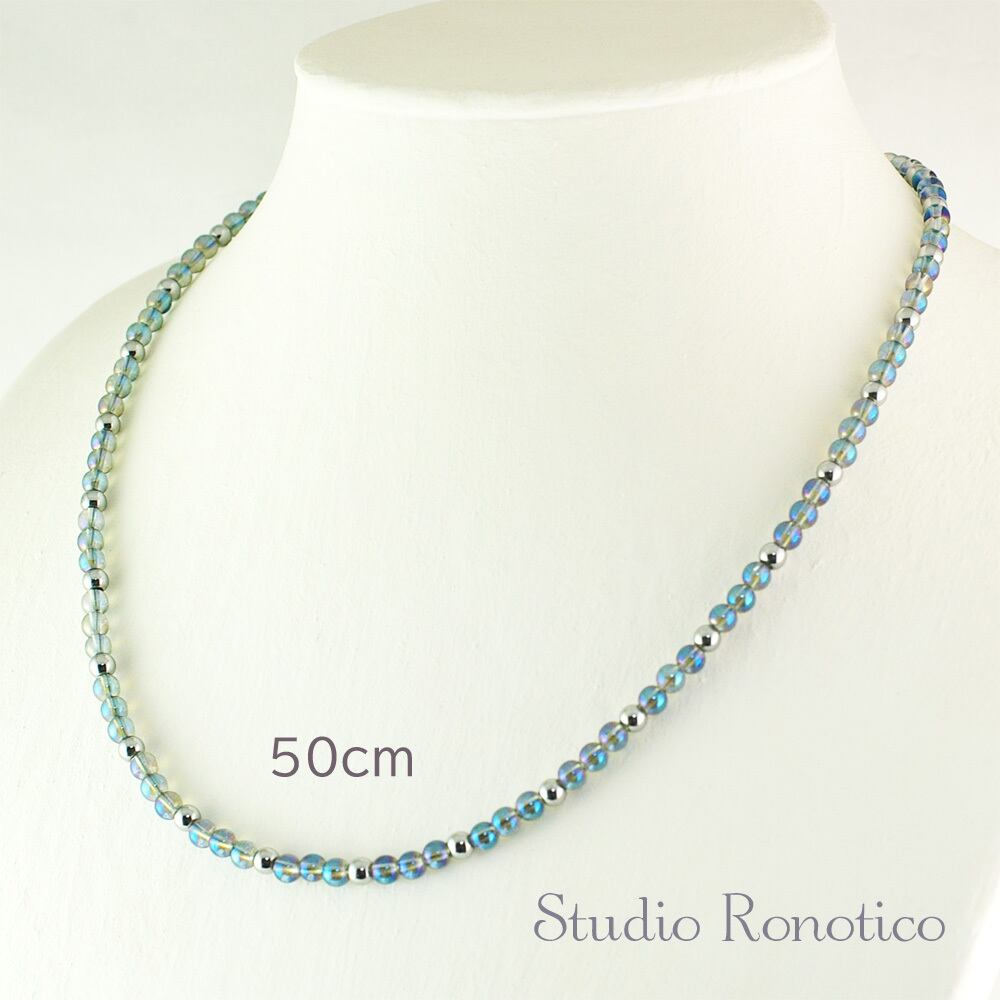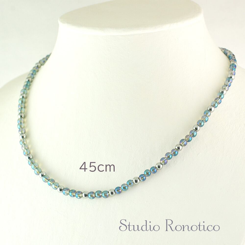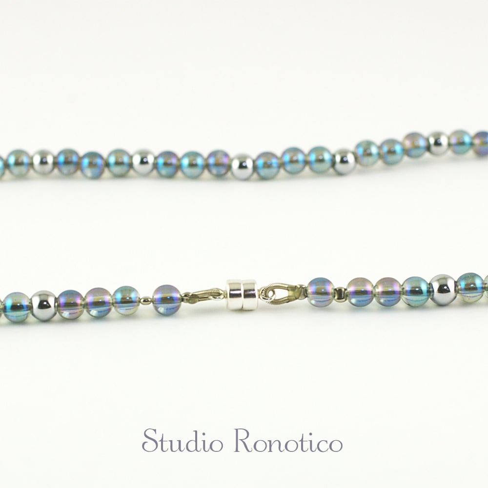 4mm丸玉のブルーフラッシュクリスタル と磁気ヘマタイトを3粒毎に配したシンプルなデザイン。