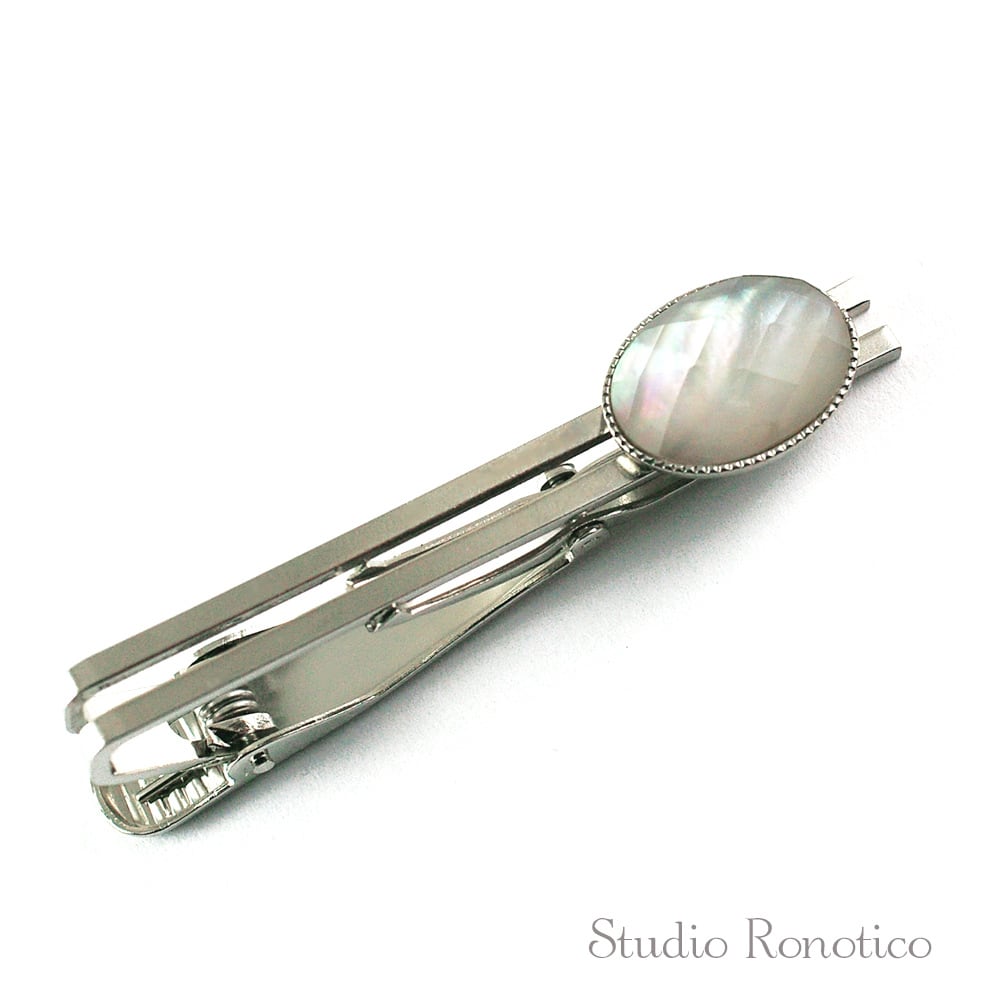 白蝶貝の上に、チェッカーカットを施した天然水晶を重ねた、美しい光沢のカボションの石を使ったネクタイピン。